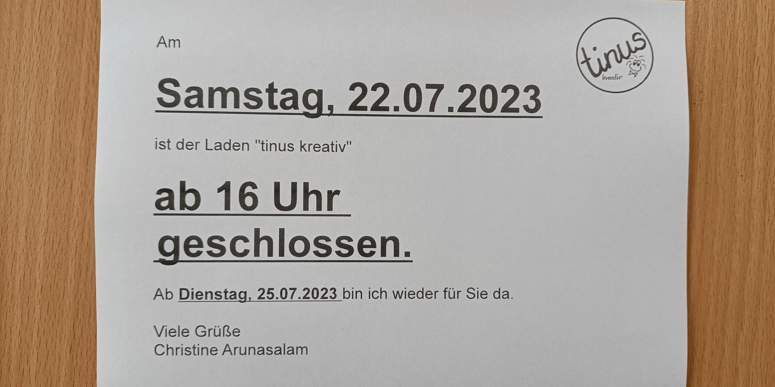 Juli212023AktuellesAm 22.07.2023 ist der Laden „tinus kreativ“ ab 16 Uhr geschlossen! Kategorie: Aktuelles21. Juli 2023Kommentar hinterlassen Autor: Christine Arunasalam KommentarnavigationZurückVorheriger Beitrag:Neue Öffnungszeiten ab 04.07. – 11.08.2023NächstesNächster Beitrag:Weihnachtsferien 2023 – 2024Ähnliche BeiträgeAusverkauf, alles muss raus, 25%, 50%, 70% Rabatt auf Bastelartikel29. Mai 2025Geänderte Öffnungszeiten, da ich zum 30.06.2025 schließe29. Mai 2025Räumungsverkauf22. April 2025Dienstag, 22.04.2025 geschlossen21. April 2025Ladies Night26. Februar 2025Super-Sale am 08.03.202526. Februar 2025