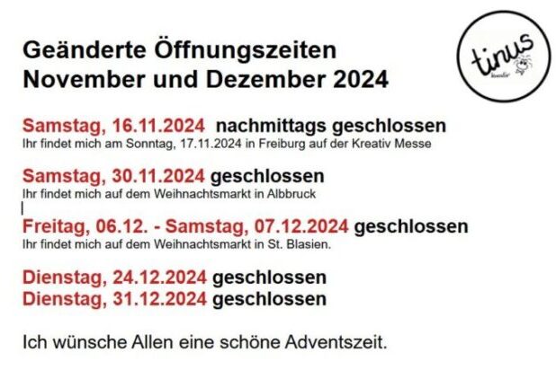Liebe Kundinnen und Kunden, am Freitag, 30.06.2023 wird der Laden „tinus kreativ“ geschlossen bleiben. Ab Samstag, 01.07.2023 sind wir zu den gewohnten Öffnungszeiten wieder für Sie da. Liebe Grüße Christine Arunasalam