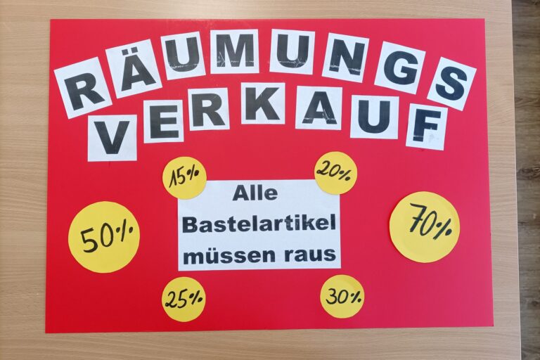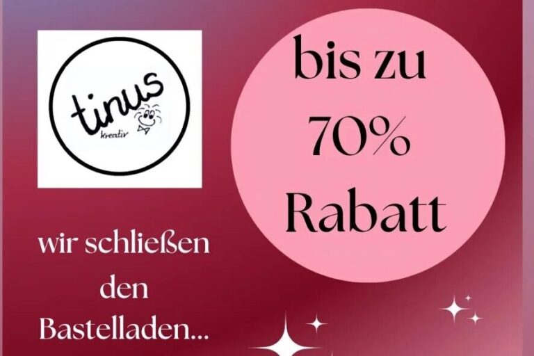 Da ich den Bastelladen zum 30.06.2025 schließen werde ist Räumungsverkauf bei tinus kreativ. Alle Bastelartikel sind kräftig reduziert, es gibt: 50% Rabatt auf alle Bastelartikel, die nicht bereits reduziert sind, 10% Rabatt zusätzlich auf bereits reduzierte Bastelartikel 25% Rabatt auf Wolle zund Zubehör. Ich freue mich, wenn Sie vorbei schauen. 🙂