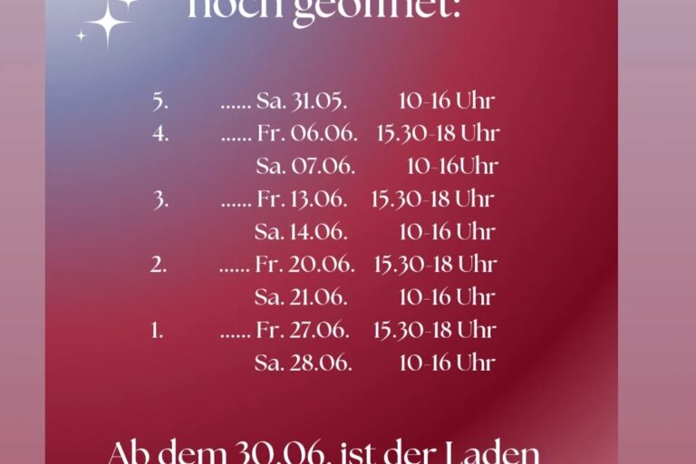 Ich schließe den Bastelladen zum 30.06.2025! Anbei finden Sie die Öffnungszeiten bis dahin, da ich die Zeiten drastisch eingeschräkt habe. Sa. 31.05.2025 10-16 Uhr Fr. 06.06.2025 15.30-18 Uhr Sa. 07.06.2025 10-16 Uhr Fr. 13.06.2025 15.30-18 Uhr Sa. 14.06.2025 10-16 Uhr Fr. 20.06.2025 15.30-18 Uhr Sa. 21.06.2025 10-16 Uhr Fr. 27.06.2025 15.30-18 Uhr Sa. 28.06.2025…