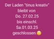 Am Dienstag, 22.04.2025 bleibt der Laden „tinus kreativ“ geschlossen. Ab Mittwoch, 23.04.2025 bin ich wieder für euch da. 🙂 Kategorie: Aktuelles21. April 2025Kommentar hinterlassen Autor: Christine Arunasalam KommentarnavigationZurückVorheriger Beitrag:Ladies NightNächstesNächster Beitrag:RäumungsverkaufÄhnliche BeiträgeAusverkauf, alles muss raus, 25%, 50%, 70% Rabatt auf Bastelartikel29. Mai 2025Geänderte Öffnungszeiten, da ich zum 30.06.2025 schließe29. Mai 2025Räumungsverkauf22. April 2025Ladies Night26. Februar 2025Super-Sale am 08.03.202526. Februar 2025Laden geschlossen26. Februar 2025