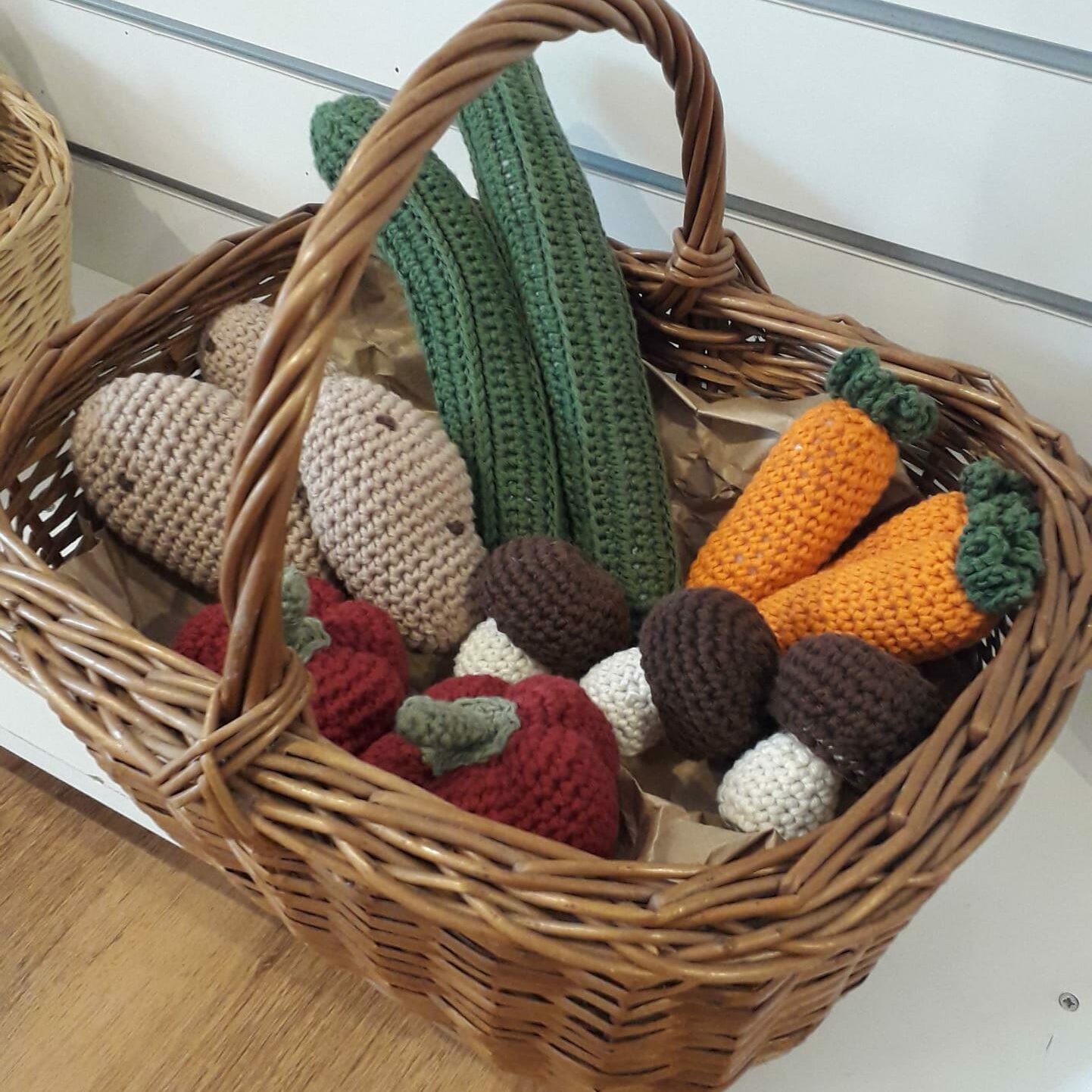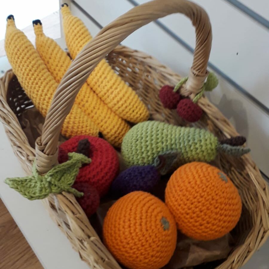 Die Lösung war gehäkeltes Obst. Waschbar bei 60°C und groß genug um keine Gefahr für die Kinder darzustellen. Mittlerweile zählt das Obst zu den Lieblingsspielzeugen der Kleinen 😉!